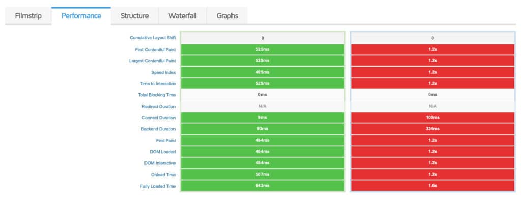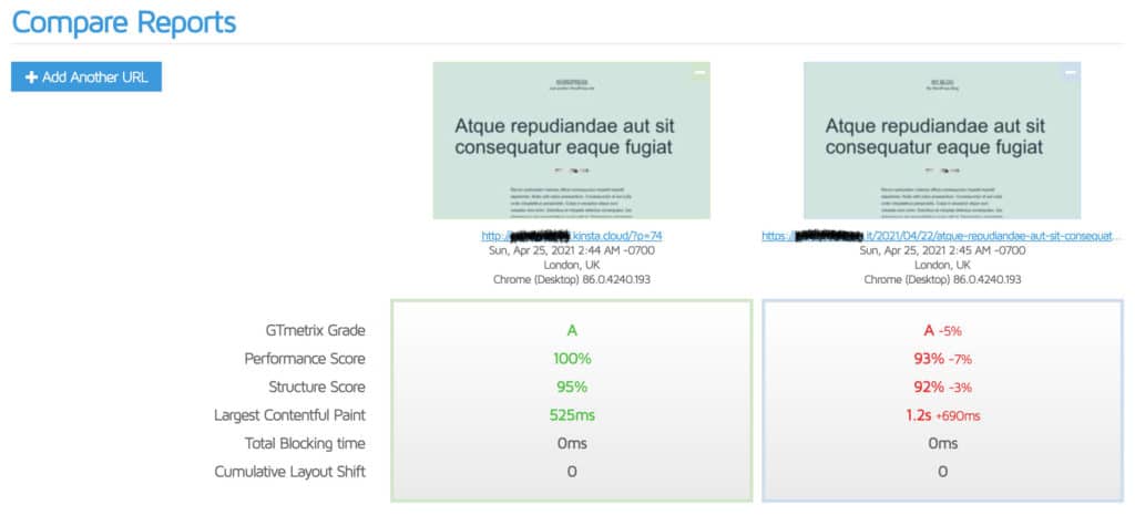 Per avere un confronto diretto tra i due ambienti di hosting, abbiamo anche eseguito dei test comparativi sul server di Londra di GTMetrix.