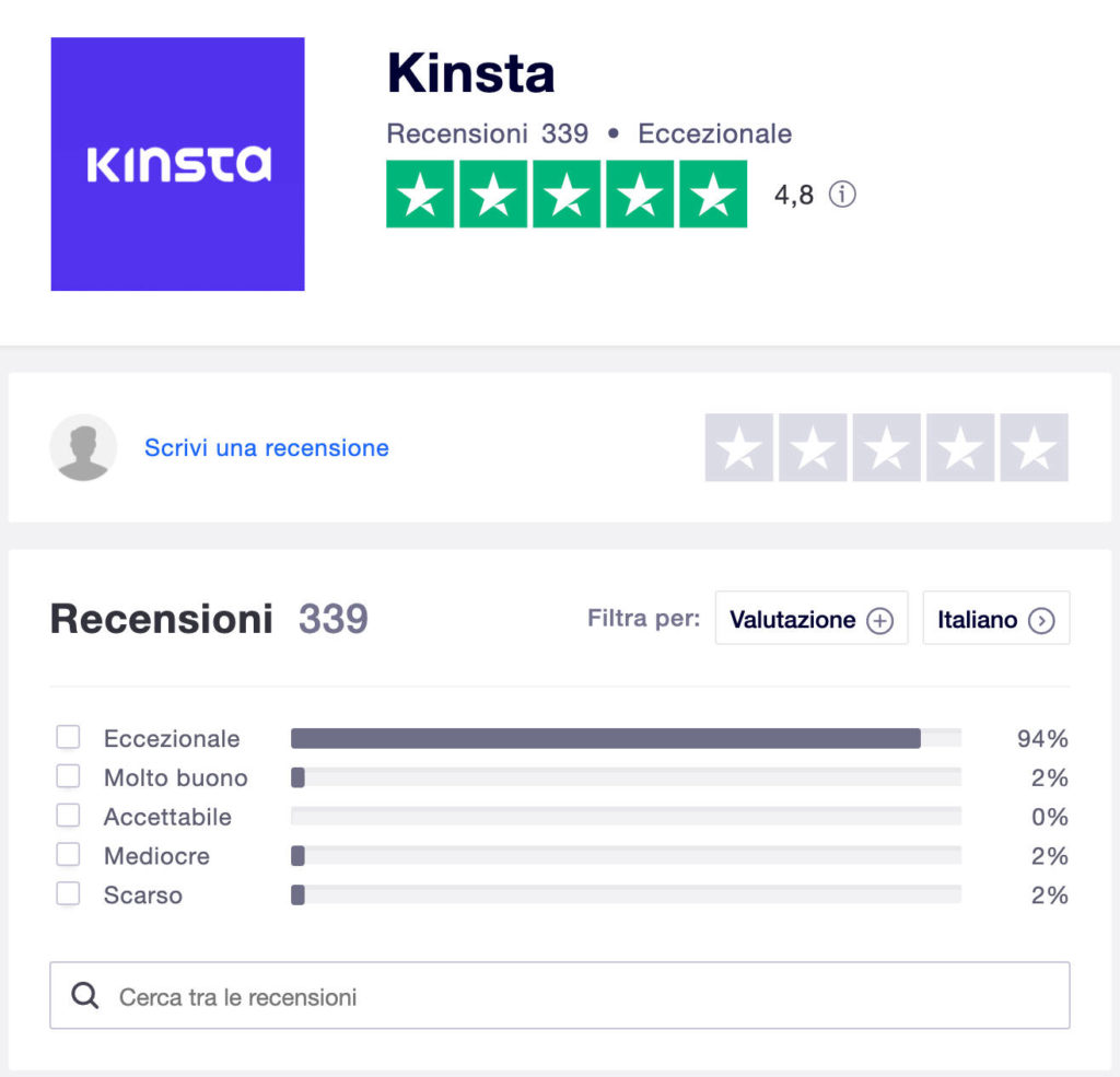 Oltre ad essere l’host WordPress gestito con il più alto rating su G2, Kinsta vanta un’altissima reputazione anche su Trustpilot, con il 93% dei clienti che valutano eccezionale l’hosting WordPress gestito e il servizio di supporto di Kinsta.