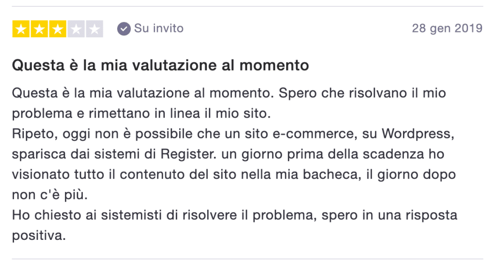 Su Trustpilot, Register.it conta oltre 2400 recensioni, ma con un buon 10% di clienti assolutamente insoddisfatti, mentre il 69% dei clienti assegnano a Register.it il massimo dei voti.