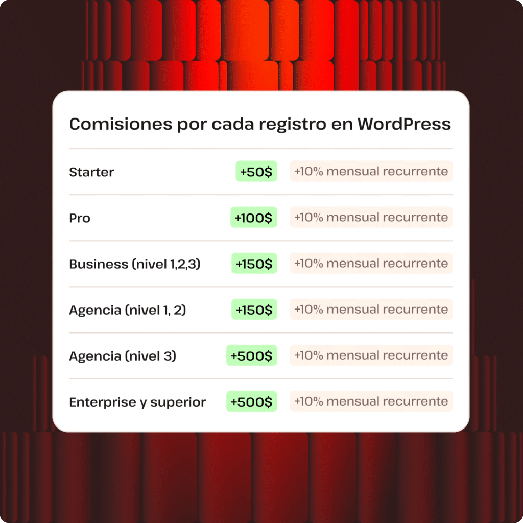 Como afiliado de Kinsta, puedes ganar importantes bonificaciones únicas y comisiones mensuales recurrentes por cada nuevo cliente que recomiendes. Sin comisiones para ti, sólo recompensas.