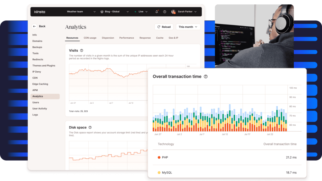 All Kinsta plans come with a free custom-built APM tool that can be easily accessed in the MyKinsta dashboard. Kinsta APM provides you with key WordPress performance insights and metrics without the need to pay for third-party subscriptions to other APM services.